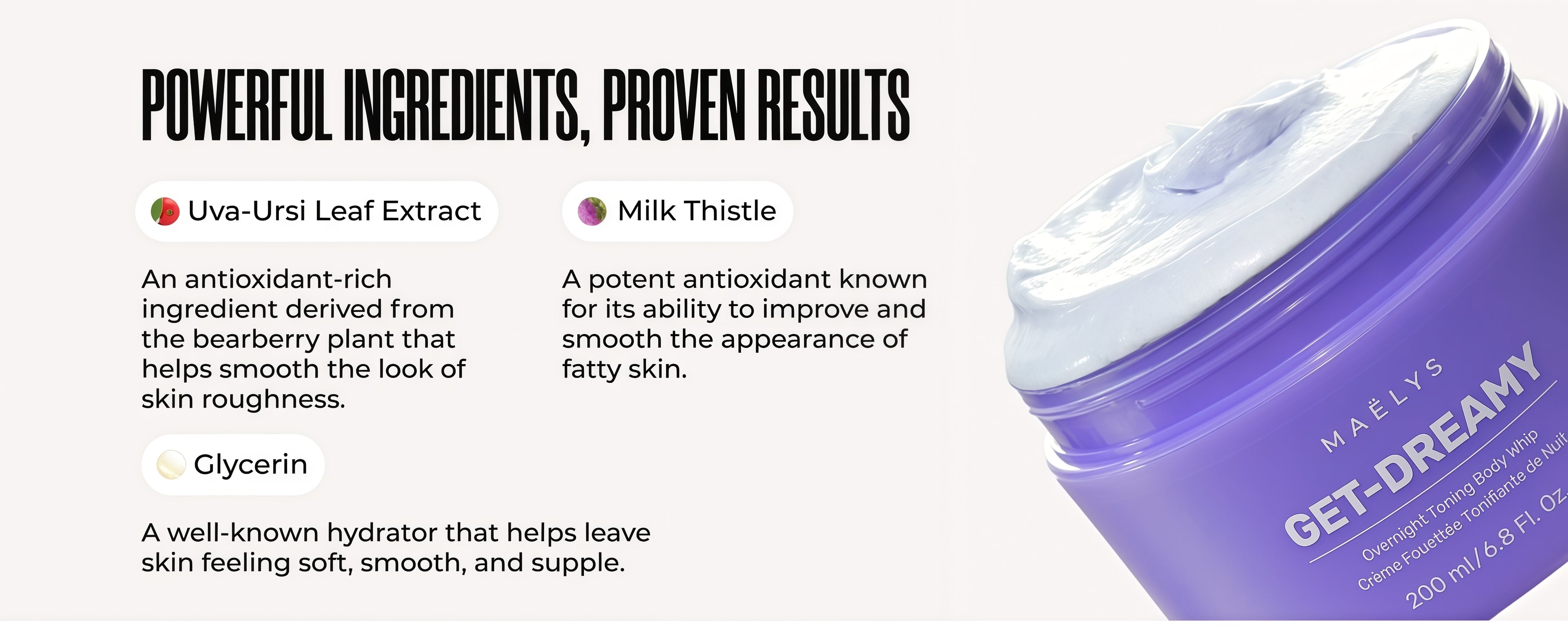 Wake up to softer, smoother, and more toned skin. Get Dreamy Overnight Toning Body Whip melts effortlessly into your skin, delivering deep hydration and firming benefits while you sleep. Infused with nourishing botanicals and skin-loving ingredients, its silky texture and soothing scent create a spa-like nighttime ritual. Let your body rest, recover, and glow — all while you dream.